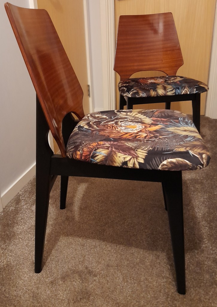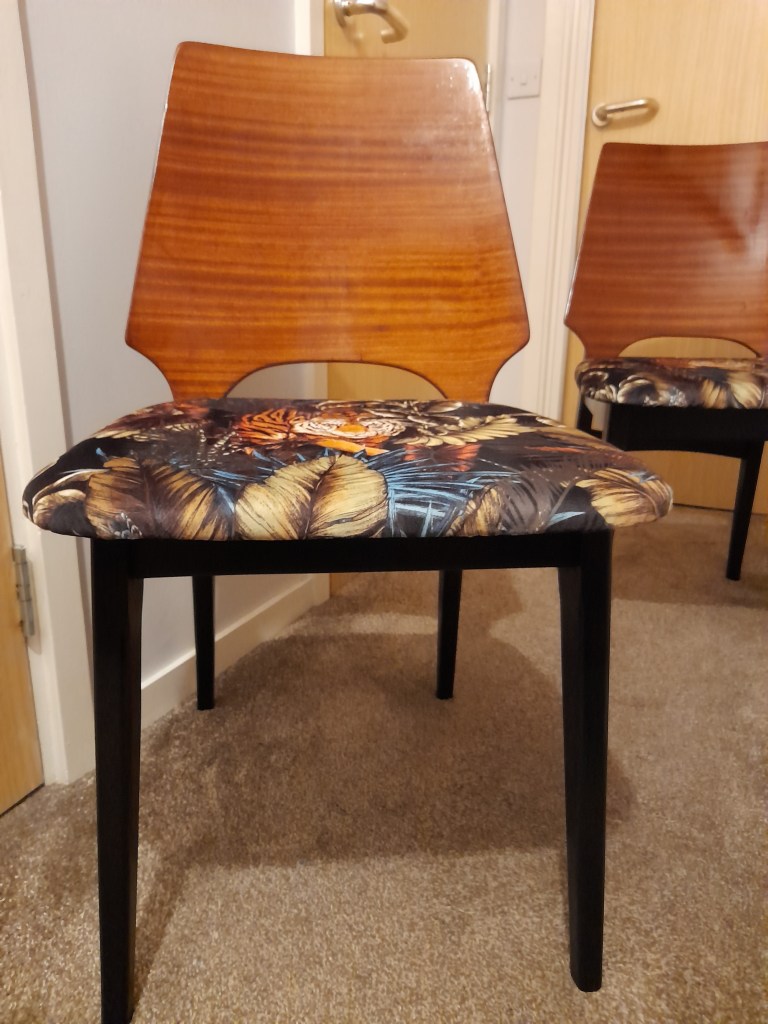 I couldn’t find any pictures on the net of what the chairs may have looked like originally, so I’ve kept the chair backs natural with Danish oil, the frames are black chalk painted with black wax, the seat pads were re-upholstered, with the outer fabric a modern tiger print velvet feel fabric to give a pop of colour.
