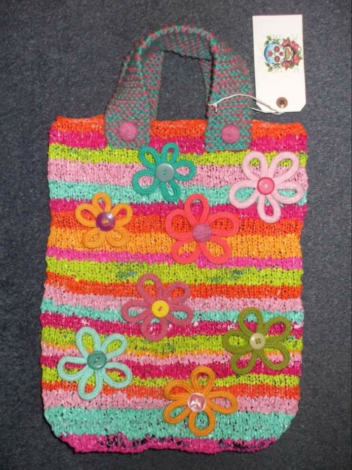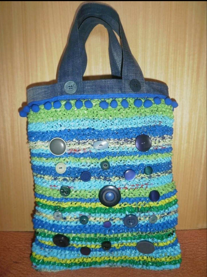 One thing I found kept me busy and produced new items from the carrier bags was making plastic bags from plastic bags. The following photos show some of the bags which I made almost a decade ago, they were all given to Barnardo’s who duly sold them and thus raised money for a very worthwhile cause. I used bits of wool, buttons from the button box, old clothing, etc., to produce the trims on the bags. This was the start of my bag making and it then progressed onwards to making bags from old clothing and fabrics, but more of that later. Please excuse the photography, this was when cameras were still pretty basic!