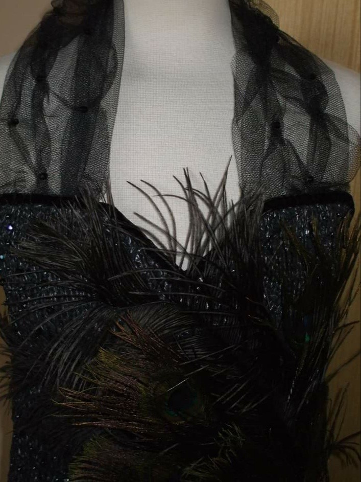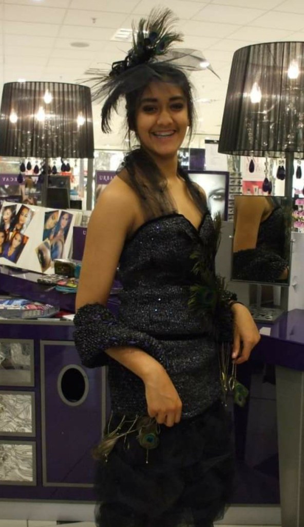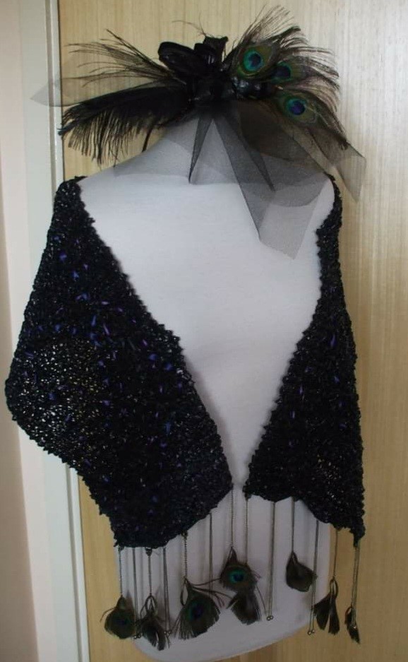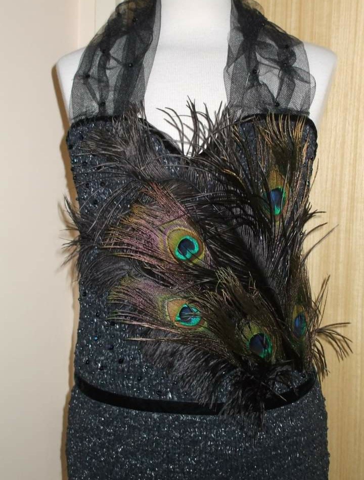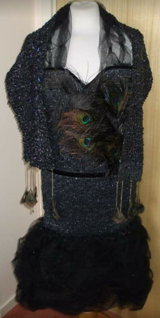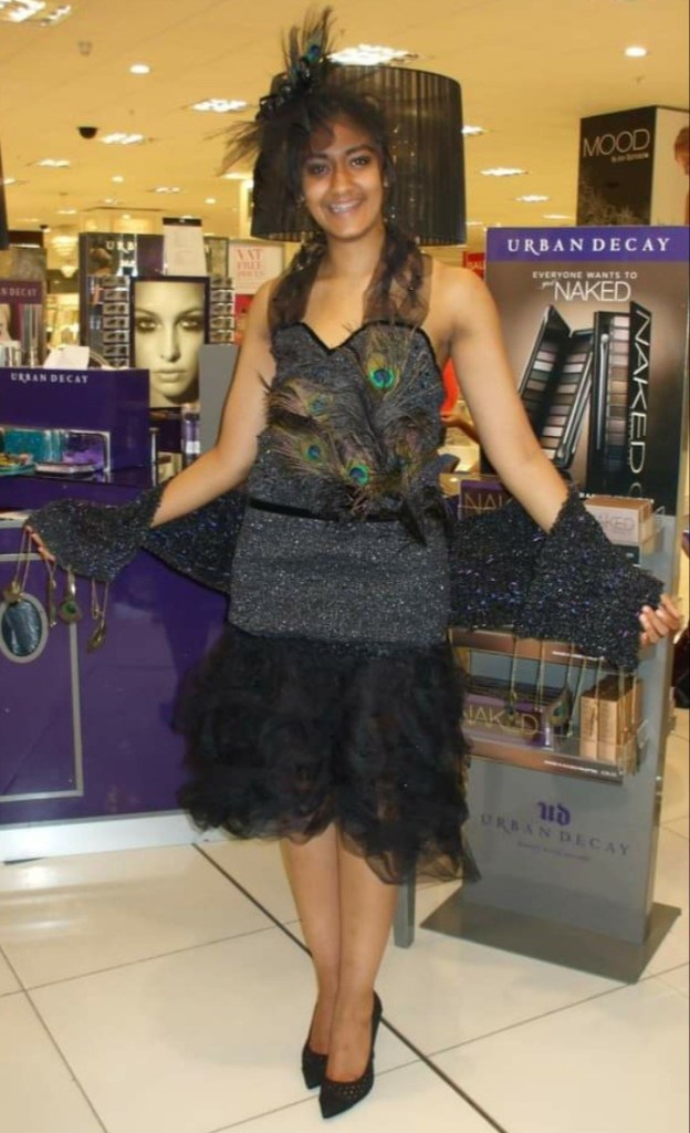 So, what happens when you combine black bin sacks, old peacock feathers from a vase, sequins, an old necklace, net and ribbon? It ends up as a dress, that then goes into a fashion show in the city. Yes indeed. This was created in 2013, it is a real dress, lined inside, complete with wrap and fascinator. It was modelled by a wonderful model and although the dress was not made to fit her, it came out as a pretty good fit (size 10). The fashion show was organised by Barnardo’s and Urban Decay cosmetics, to raise funds for Barnardo’s. Who knew that bin sacks could have another purpose apart from putting the trash in.