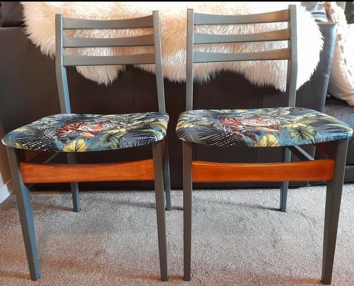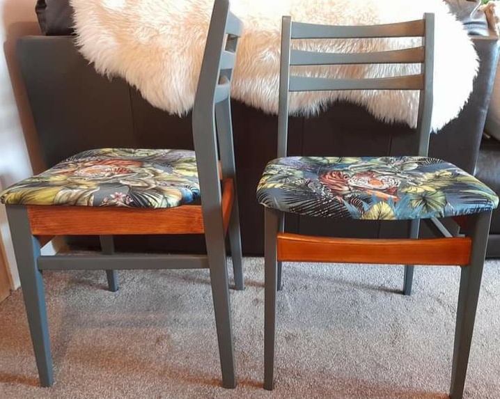 I got the dining suite for free, the table top is dark grey and the legs are being left as natural wood to match the 2 chairs pictured above. The fabric is a velvet type fabric, Prestigious Textiles Bengal Tiger, which I’ve used previously in a different colourway.