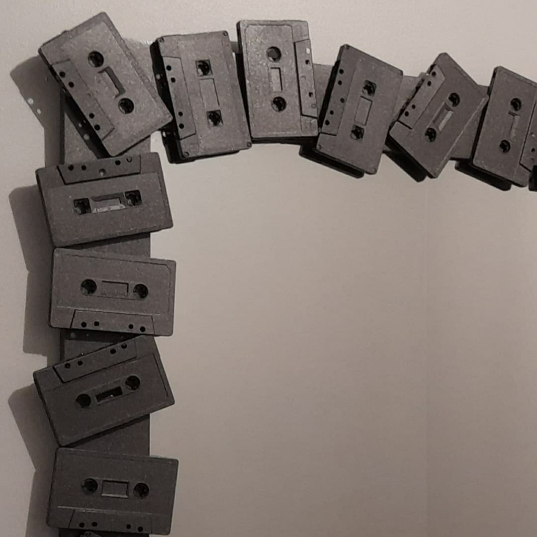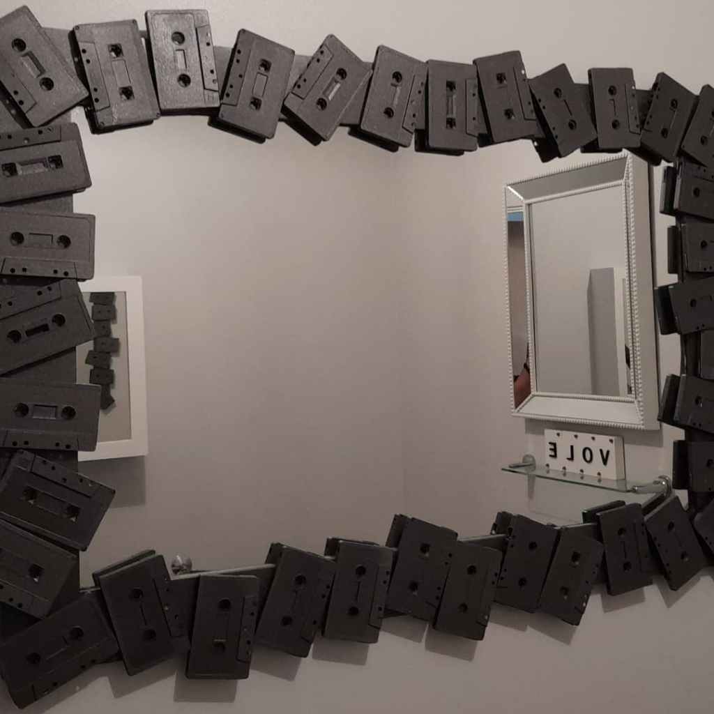 I acquired a bag full of them and had an old mirror kicking about, thus emerged the crazy cassette tape mirror. The hardest thing was scrubbing labels off the cassettes and taking the tape out of them. The tapes have been placed randomly in no particular order.