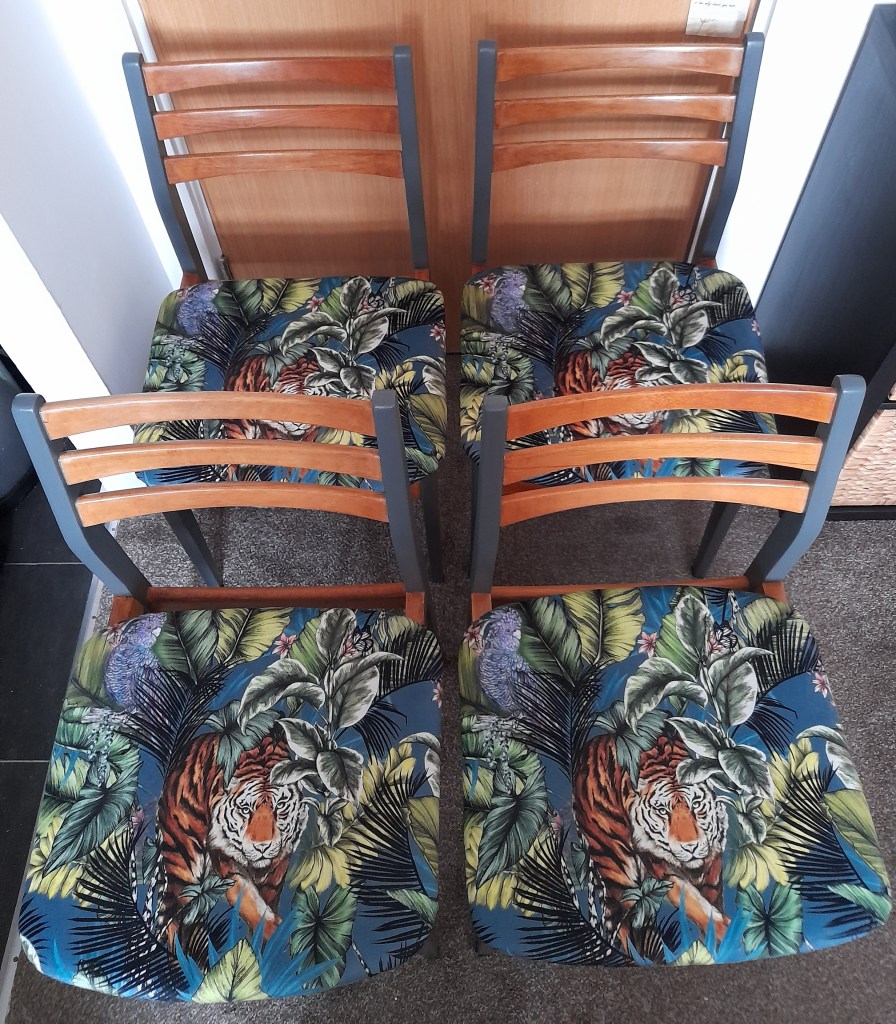 #midcenturymodern #mcm #upcycledfurniture #upcycle #recycle #recycledfurniture #oldisgold #upcycleddining #upcycledtable #upcycledchairs #renovate #briwax #goodhomepaint #bengaltigerfabric #prestigioustextiles