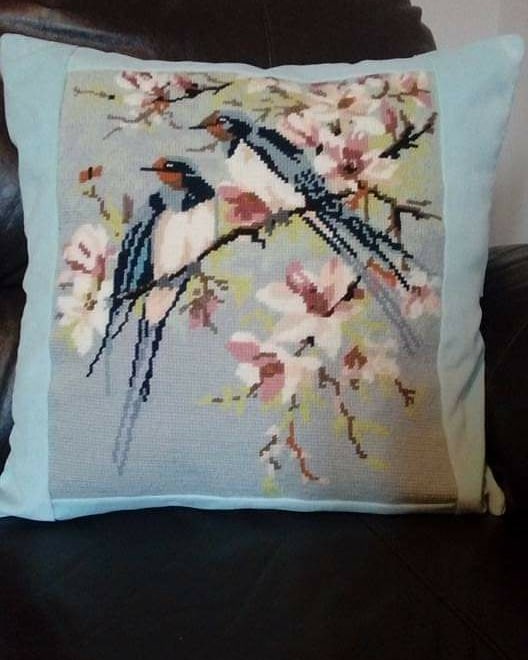 Once I started work I would still knit or embroider in the evenings, my Mum always had serious doubts that I would complete that Aran sweater with a 102 row pattern repeat, but the stitches, patterns and the mathematics of it all fascinated me. I embroidered a fair few things, which Mum then duly claimed and went off to the picture framers to get framed. I was a late starter on tapestry, in my late twenties I saw a picture of a beautiful Ehrman cushion cover and I just had to buy it, fifteen years later, after many house moves and many years lying in a box, I got it out and finished off the three quarters that still needed to be done. After that I made another three tapestry cushions and then ceased production for a few years. The one pictured below I found in a charity shop, minus the wools, a quarter of it completed and grubby. I bought new wools, unpicked the old stitches, washed it and started on it, a few weeks later it was complete, I used some velvet from another project to turn it into a cushion. Upcycle, recycled and repurposed!
