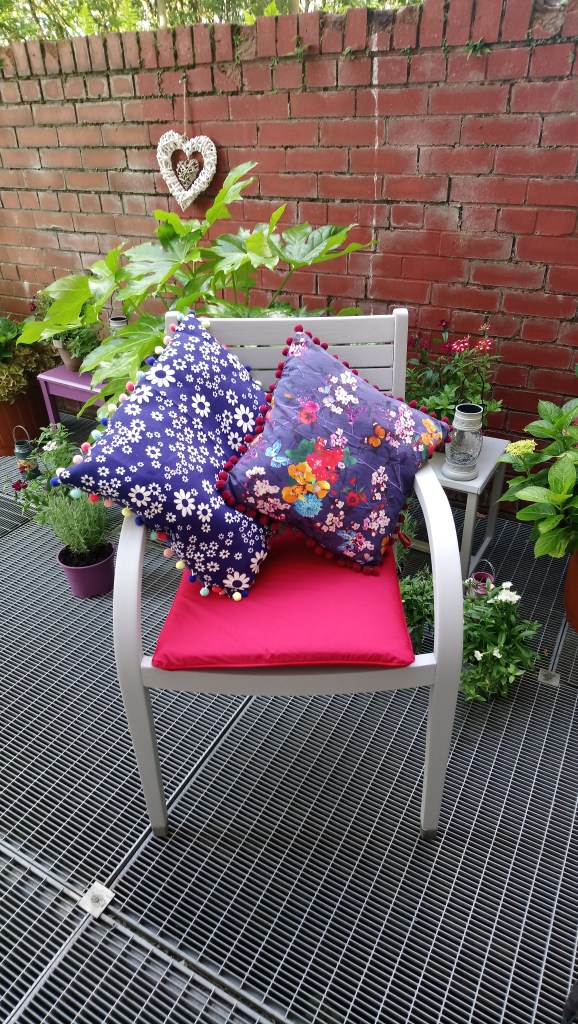 I upcycle old garden furniture, stuff that’s past it’s best, all it needs is some TLC and it’s made good again and ready for more days in the sun! I make the cushions to go on the garden furniture from old fabrics, old clothing, duvet covers, anything to hand. I’m continually amazed at the amount of garden furniture that gets thrown out every year.